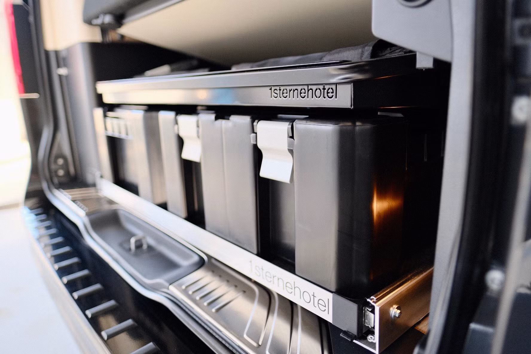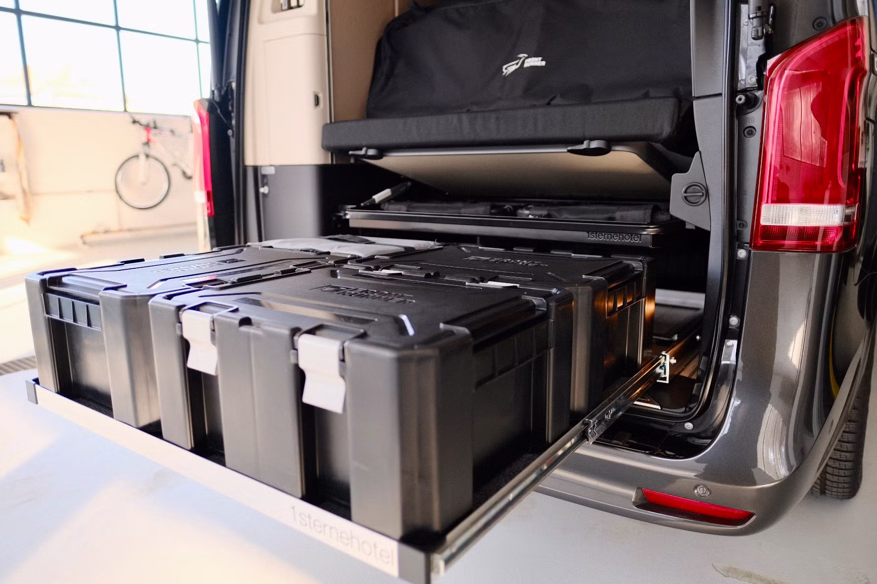Der Heckauszug für den Mercedes-Benz Marco Polo ist aus poliertem Aluminium gefertigt, dadurch sehr leicht mit einer hohen Traglast von 120 KG und einer automatischen Verriegelung.